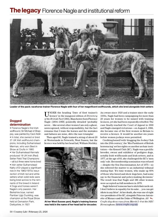 After many years campaigning, Florence Nagle, the ‘Mrs Pankhurst’ of British horse racing and dog breeding, became the first woman to receive a race horse training licence from the Jockey Club and was one of 187 women to become full members of the Kennel Club.